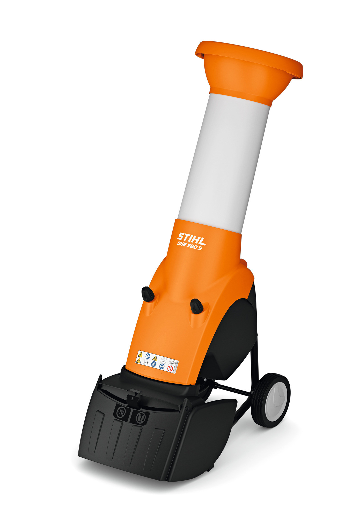 Mit dem STIHL Elektro-Häcksler GHE 260 S verwandeln Sie harte Äste und Zweige in wenigen Sekunden in kleine Schnitzel. Der Messerhäcksler verarbeitet effektiv und kraftvoll auch stärkere Äste bis zu einem Durchmesser von 40 mm mühelos. Das eingebaute Sandwich-Messerwerk verfügt über eine optimierte Anordnung der Schneidelemente aus Vorzerkleinerern, Reißmessern und wendbaren Schneidmessern. Die Kraft des starken Elektromotors überträgt sich laufruhig auf die Multi-Cut-Messerscheibe. Er arbeitet mit Starkstrom. So können Sie bequem selbst ausladende Zweige zerkleinern. Nutzen Sie für diesen Fall einfach die weite Öffnung des schrägen Einfülltrichters. Für einen hohen Komfort beim Arbeiten ist der Trichter lärmgedämmt und mit einem Spritzschutz ausgestattet.